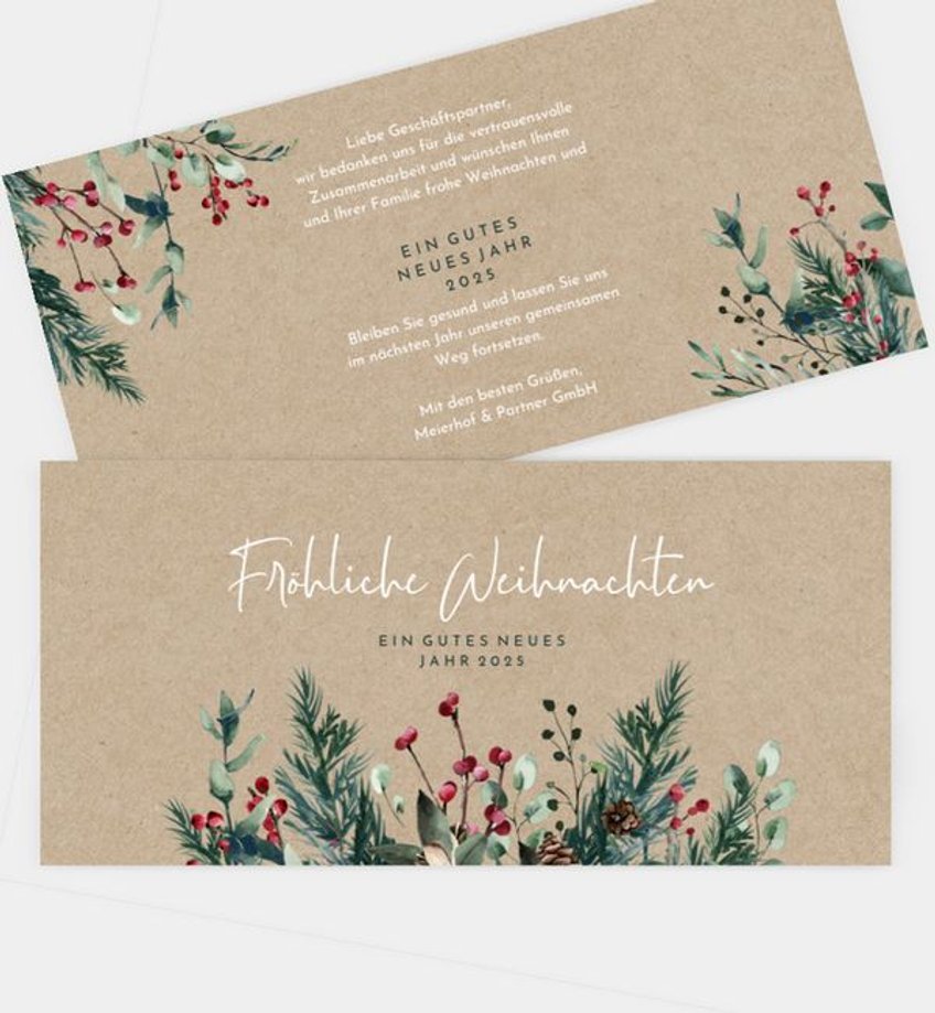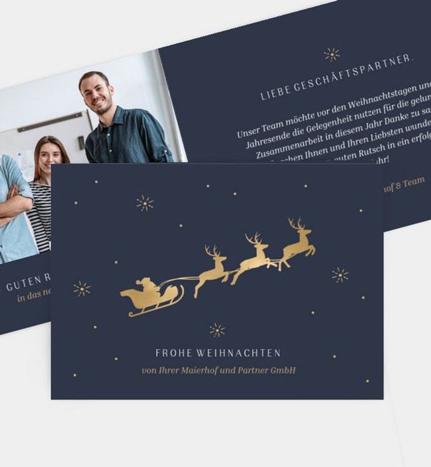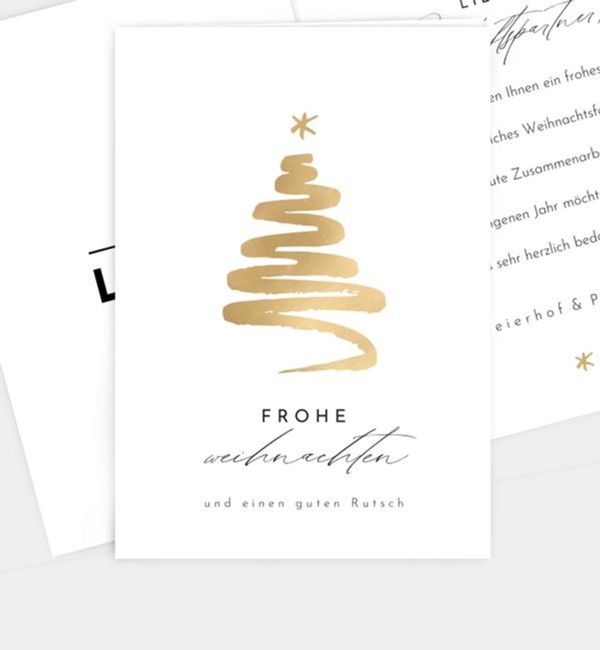 In vielen Unternehmen gehört es zum guten Ton, sich zum Jahresende bei den Geschäftspartnern zu bedanken. Ist man häufig im Austausch miteinander, fällt es bedeutend leichter, passende Weihnachtsgrüße geschäftlich zu verfassen. Doch auch dann ist es ab und an schwierig, die richtigen Worte zu finden. Lassen Sie sich von unseren Weihnachtsgrüßen und Zitaten für Texte auf Weihnachtskarten im geschäftlichen Umfeld inspirieren und greifen gerne auf eine unserer Textvorlagen sowie unsere Vorlagen an Designs für geschäftliche Weihnachtskarten zurück. Ihr Firmenlogo oder das Ihrer Partner können Sie individuell darauf platzieren und vorab als Musterkarte bestellen.