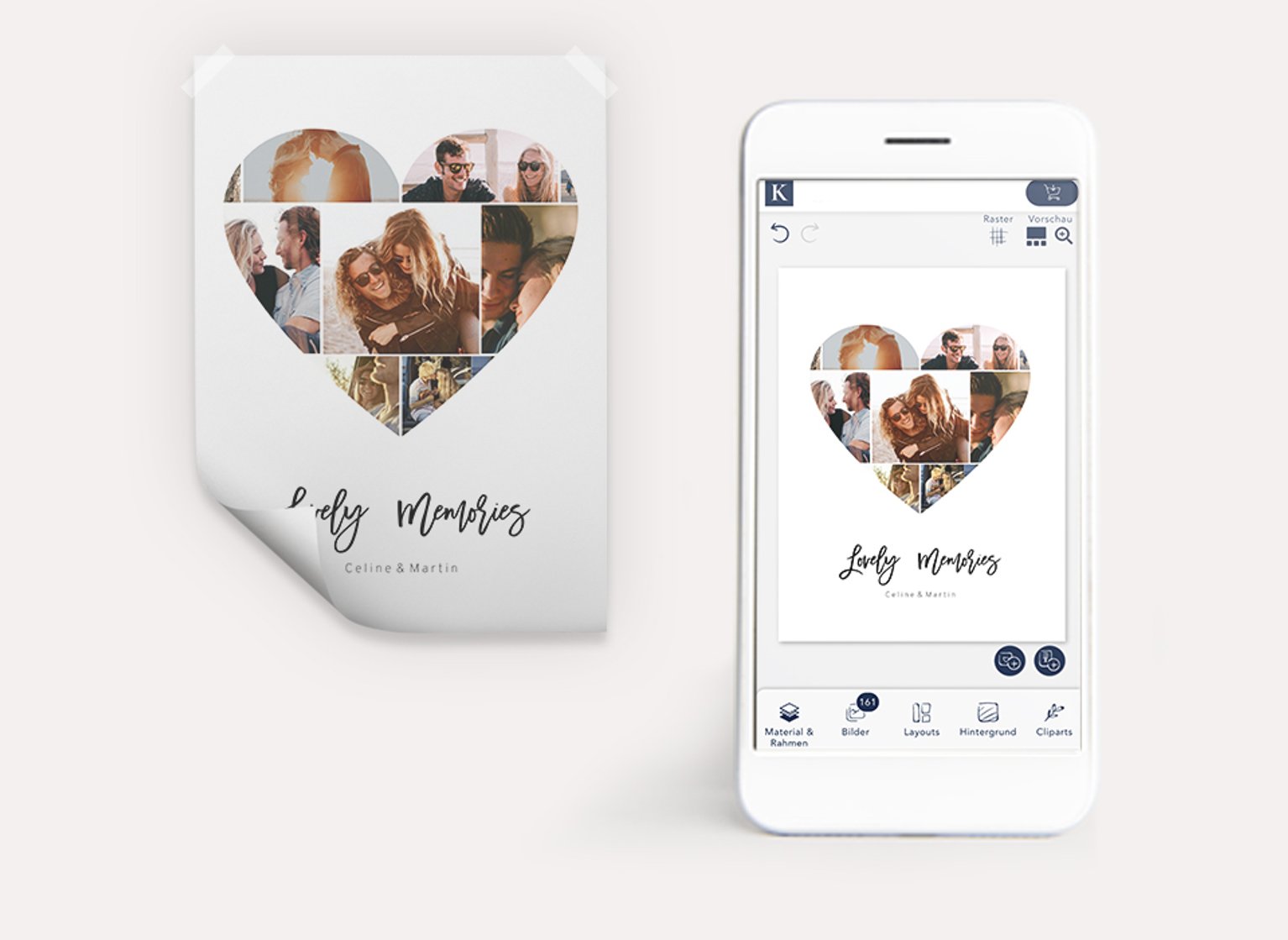 In dem gesamten Gestaltungsprozess der Herz-Fotocollage bietet Ihnen die Kartenliebe die komplette künstlerische und kreative Freiheit. Ihre Collage als Herz personalisieren Sie in Bezug auf das verwendete Material und das gewünschte Format nach Ihrem Wunsch. So haben Sie die freie Wahl zwischen verschiedenen Ausführungen Ihrer Foto-Herz-Collage: Von hochwertigen Leinwänden als Fotocollage Herz bis hin zu qualitativen Postern für Fotocollagen in Herzform! Für jedes Produkt stehen Ihnen die passenden Rahmen zur Verfügung, welche die Fotocollage Herz edel und elegant wirken lassen. Zusätzlich finden Sie bei uns viele Designvorlagen rund um besondere Anlässe wie Fotocollagen zu Weihnachten oder Collagen für Ihr Baby. Suchen Sie sich Ihr Lieblingsdesign aus und legen direkt los mit der Gestaltung Ihrer einzigartigen Fotocollage als Herz!