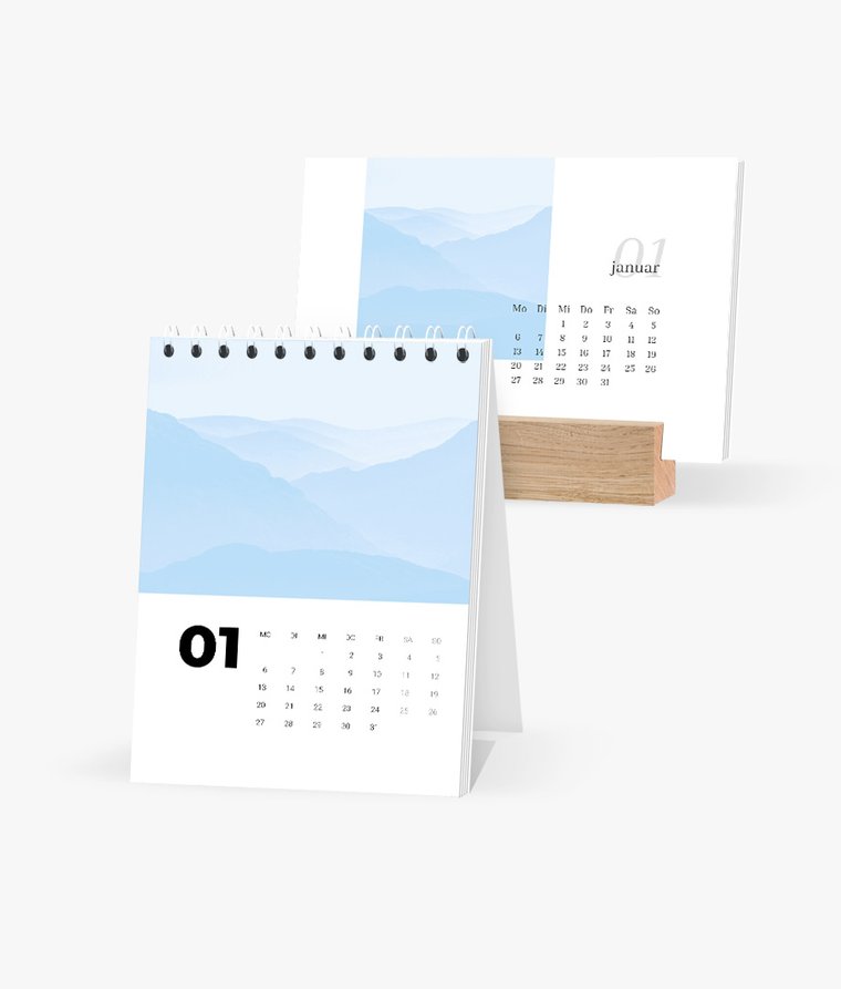 Format wählen: Oftmals sind Tischkalender quer aufgebaut und haben eine geringe Höhe. Dafür sind sie etwas breiter. Wir führen auch Sonderformate, unter anderem quadratische Aufstellkalender. Es sind auch Fotokalender mit Holzaufsteller möglich.