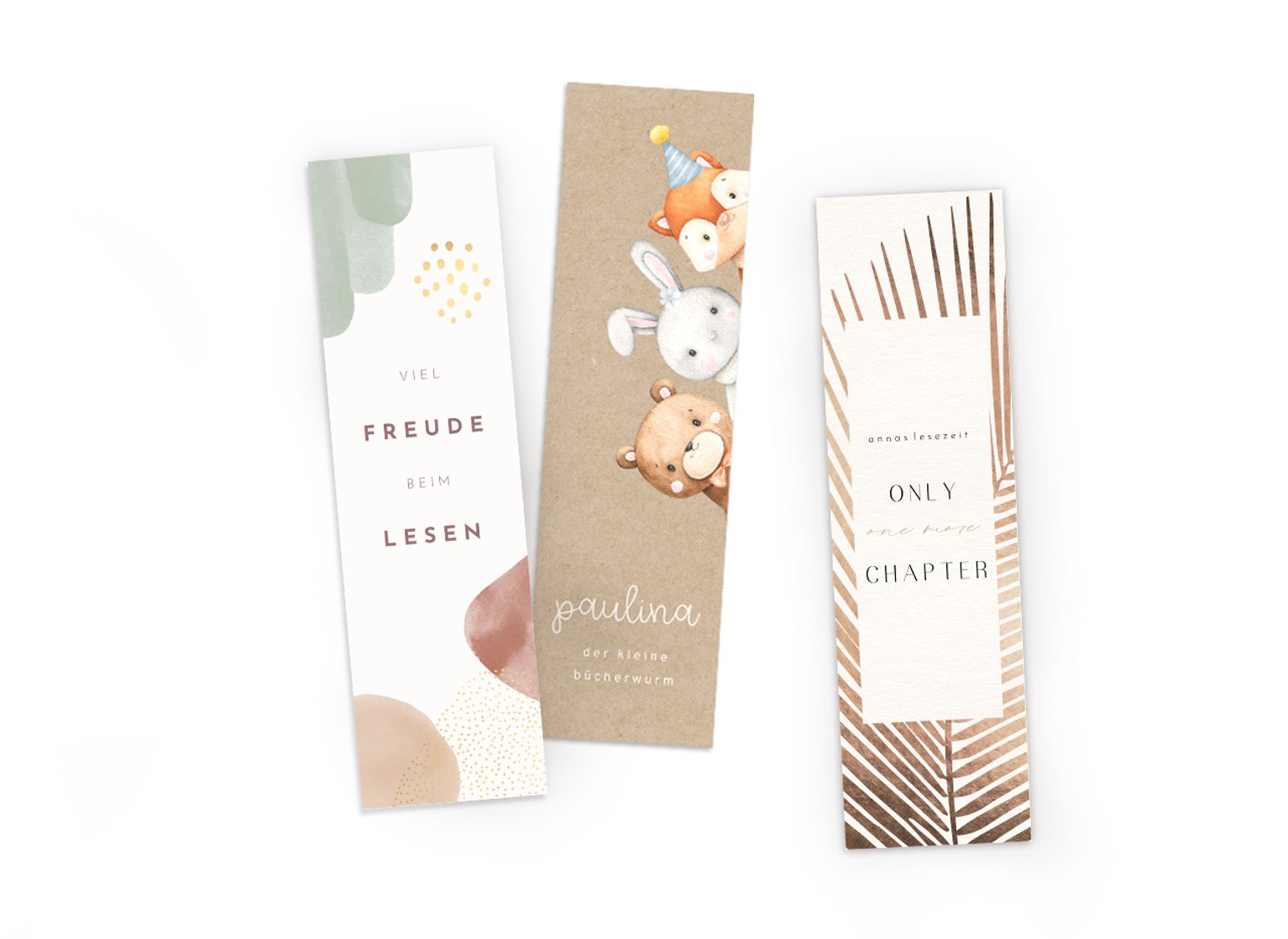 Bei der Kartenliebe gestalten Sie persönliche Lesezeichen im Handumdrehen selbst. Die personalisierten Lesezeichen eignen sich auch wunderbar als Geschenk für Freunde und Familie! Die Gestaltung der Lesezeichen ist dabei ganz intuitiv: die passende Designvorlage und eine der hochwertigen Papiersorten wählen und im Online-Konfigurator nach Ihrem Geschmack personalisieren! Dazu fügen Sie ganz einfach Ihre schönsten Bilder, Textfelder für persönliche Notizen oder elegante Cliparts ein. In dem gesamten Gestaltungsprozess sind Ihrer Kreativität keine Grenzen gesetzt! Stöbern Sie jetzt durch unsere große Auswahl an verschiedenen Designvorlagen für Ihr individuell gestaltetes Lesezeichen.